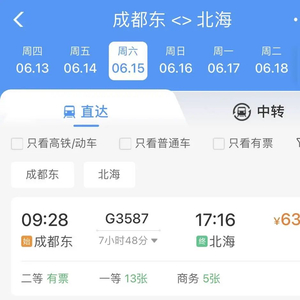 成都东至北海将开行直通动车