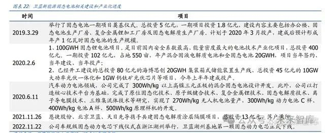 公司深度布局固态电池。2019 年,公司举行固态电池一期奠基仪式,建成后预计形成年 产 1 亿瓦时固态电池的生产规模;2022 年 11 月,公司第一颗固态电池电芯已经正式下 线。公司在无人机电池、储能电池、汽车动力电池等领域均布局了混合固液电池/固液电 池,且以打造核心技术平台为基础,完成了原位固态化技术、复合金属锂技术、固态电 解质技术等研究。