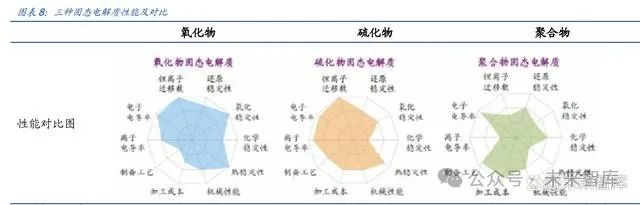 固态电解质主流三大路线各有优劣。氧化物/硫化物/聚合物电解质等三大主流路线各有 优劣。总体来看,当前氧化物固态电解质的进展最快,其次是硫化物体系,而聚合物体 系虽已经实现小规模量产,但还需向高能聚合物电解质方向发展,而目前高能聚合物电 解质仍处于实验室阶段。 聚合物电解质:具有较好的高温性能,灵活性好、容易大规模制备薄膜等优点。POE 基电解质在 60℃以上离子电导率有所提升,但此时聚合物呈现融化状态,其力学特 征有所下降。但在室温时,聚合物的缺点在于离子电导率低。 氧化物固态电解质:具有较高的稳定性,且机械性能好,但存在着界面接触差的问 题。总体来看具有较综合的性能和成本,相对较低的技术难度。 硫化物固态电介质:由于具有更大的离子通道,因此离子导电性在三种材料中最好, 综合性能也在三者中最优。但是硫化物固体电解质容易和空气中的水反应生成硫化 氢等有毒气体,因此相对来说容易氧化、对水汽敏感,稳定性较差、对生产环境比 较严苛、制造难度和成本更高。