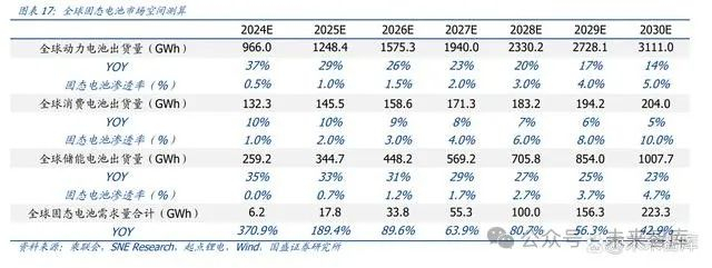 到 2030 年固态电池有望超 200GWh 市场场规模。 1)预计 2025 年固态电池需求量为 17.3GWh:假设 2024-2025 年全球新能源车销量 增速为 30%、28%,单车带电量年均提升 0.5 度电;假设 2024-2025 年全球 3C 锂电池 出货增速 10%;假设 2024-2025 年全球储能锂电池出货增速 35%、33%。则对应 2025 年全球动力/消费/储能电池的出货量分别为 1248/146/345GWh,在固态电池渗透率为 1%/2%/0.7%的假设下,对应 2025 年全球固态电池需求量为 17.3GWh。 2)预计 2030 年固态电池需求量为 217GWh:在全球动力电池部分,假设 2026 年全 球新能源车销量增速为 25%,此后每年减少 3pct;单车带电量仍每年提升 0.5 度电;在 全球储能电池部分,假设从 2025 年开始每年增速降低 3pct;在全球 3C 电池部分,假设 从 2025 年开始每年增速降低 1pct。则 2030 年全球动力/储能/消费电池的出货量分别为 2980/1008/204GWh。在固态电池渗透率为 5%/10%/4.7%的假设下,对应 2030 年全球 固态电池需求量为 223.3GWh,2025-2030 年 CAGR 为 65.8%。
