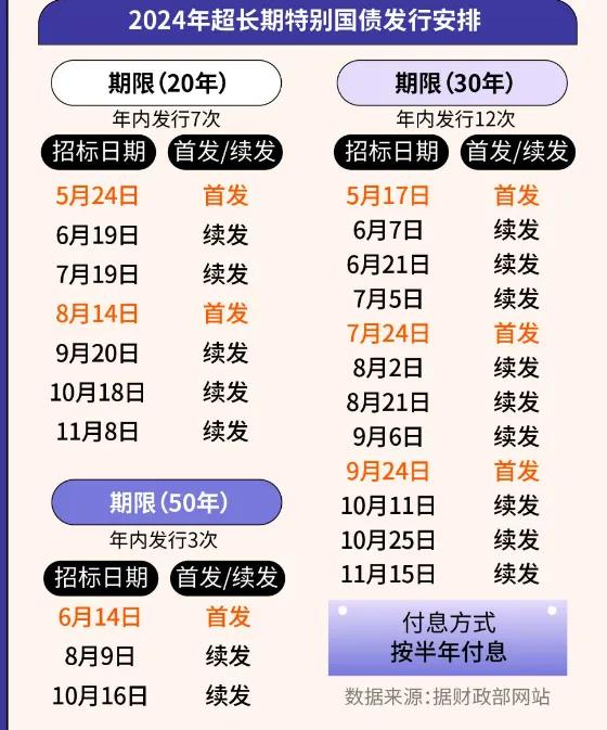 根据财政部官网发布的消息,这次10000亿超长期国债分批发售,有20年,30年,50年三种,年限不同,利息也不同。