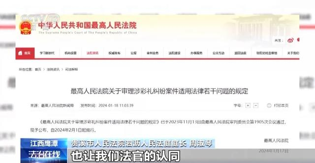 贵溪市人民法院泗沥人民法庭庭长 周淑琴:整个司法解释内容对于彩礼的认定,对于符合彩礼返还的情形,有了更加详细的解释。也让我们基层法官在审理此类案件中有了更多的指引和方向。