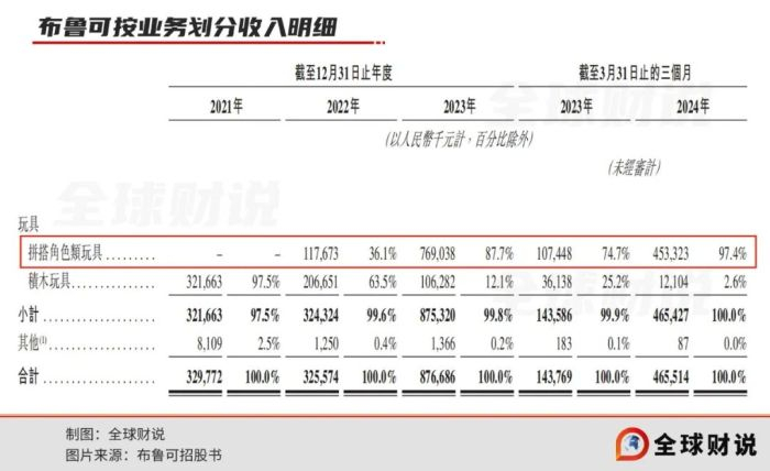 积木类玩具收入却逐渐萎缩,由2021年占总收入的97.5%减少至2024年一季度的2.6%。