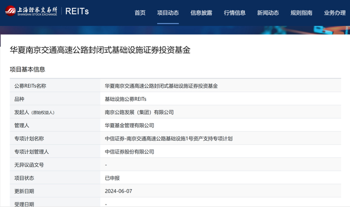 6月7日,证监会与上交所官网显示华夏南京交通高速公路REIT正式申报,成为今年以来在上交所申报的第7单公募REITs项目。该项目的正式申报,标志着高速公路REITs再添新丁,有效助力公募REITs常态化发行。