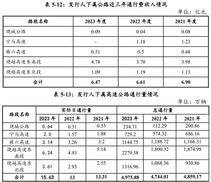 南京市交通建设投资控股(集团)有限责任公司公路业务主要为南京主要高速公路建设、投资、运营,包括绕城高速、宁马高速、雍六高速、绕越高速东南段和绕越高速东北段五条收费公路,由一级子公司公路集团及其下辖的子公司运作。五条收费公路总里程达140.68公里,近三年,总通行费收入分别为6.90亿元、6.61亿元和6.47亿元。由于疫情常态化防控后,高速公路车流量回升,各路段通行费收入均有所回升。