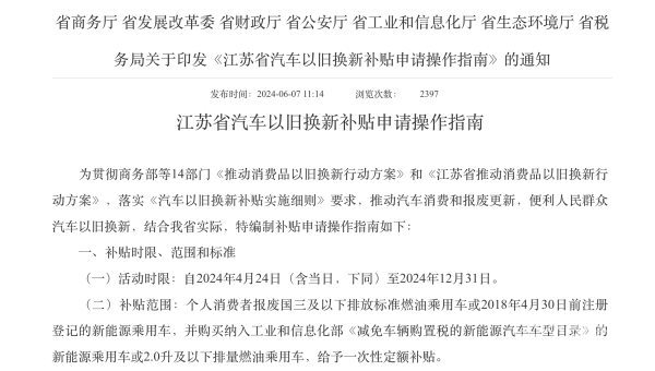6月7日,江苏省商务厅发布我省汽车补贴申请操作指南。2024年4月24日至2024年12月31日期间,个人消费者报废国三及以下排放标准燃油乘用车或2018年4月30日前注册登记的新能源乘用车,并购买纳入工信部《减免车辆购置税的新能源汽车车型目录》的新能源乘用车或2.0升及以下排量燃油乘用车,将给予一次性定额补贴。