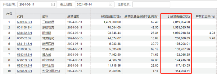 从具体个股解禁规模来看,下周解禁股名单中,解禁市值居前三位的是:三峡能源(701.91亿元)、东航物流(156.3亿元)、阿特斯(108亿元)。三者的解禁市值均超100亿元。甘肃能化(26.89亿元)、皓元医药(17.52亿元)、宏昌科技(13.34亿元)等个股紧随其后。解禁规模前十中,有8股均于下周二(6月11日)迎来解禁。