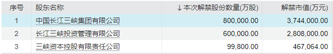 解禁的股东包括大股东中国长江三峡集团有限公司、长江三峡投资管理有限公司以及三峡资本控股有限责任公司,这三家公司作为一致行动人,持有的解禁股份相当集中。