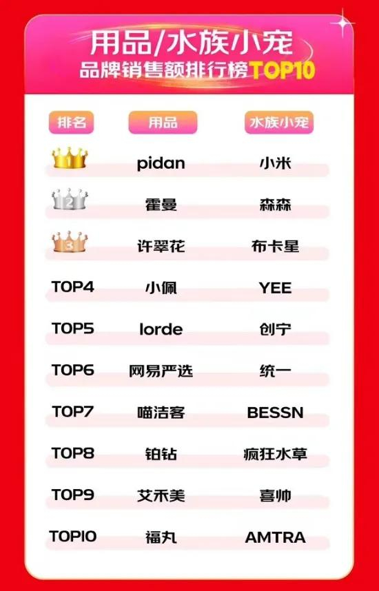 皇家、滋益巅峰、伯纳天纯、网易严选、麦富迪、pidan、霍曼、爱肯拿等多个知名品牌纷纷上榜。