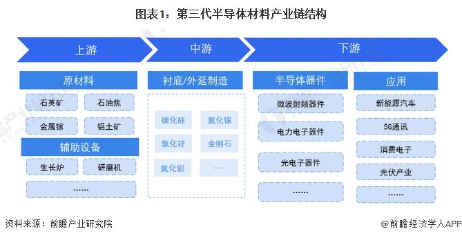 第三代半导体材料产业链与前两代半导体材料的产业链相类似,一般分为上游原料供应、中游材料制造和下游应用。