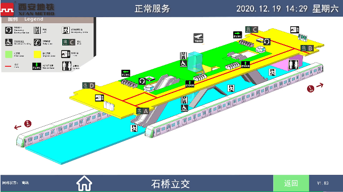 西安地铁部分车站设置有“智能客服中心”,结合乘客日常出行需求,涵盖自助票务处理、信息查询、站内导航、语音提示及召援等四项核心功能,解决乘客出行途中的大部分使用需求。乘客可自行在智能客服中心进行查询,显示界面通过站内3D立体平面图展示整体车站的布局、当前位置、卫生间、无障碍电梯及各出入口的行走路线。