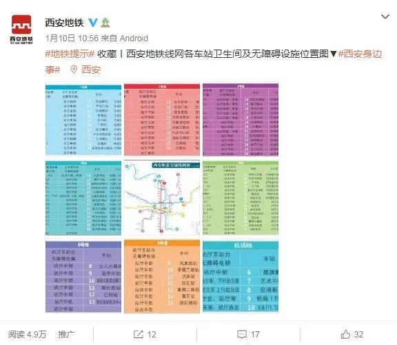 在西安地铁官方微博搜索关键词“卫生间”即可找到各条线路卫生间详细的位置信息。