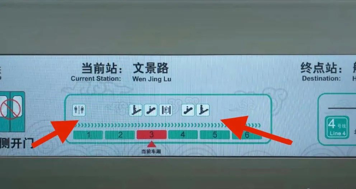 乘车时,在列车车厢LCD动态地图上,也有很多有用信息。比如到达车站卫生间、直梯、扶梯位置、所在车厢位置等都有明显的标识,坐车的时候也可以留意一下哦~
