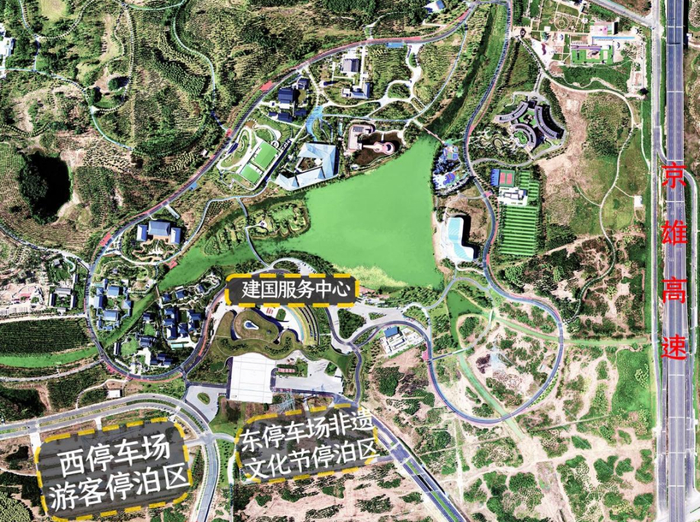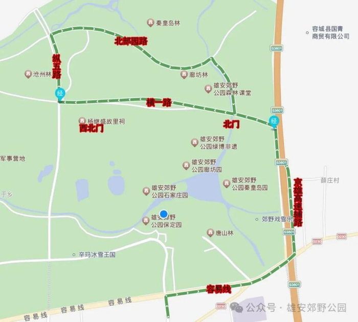路线一(常规路线):游客可在地图上导航雄安郊野公园南门,车辆可停放在郊野公园西停车场,此路线节假日客流高峰时段容易拥堵,建议优先选择路线二、路线三。