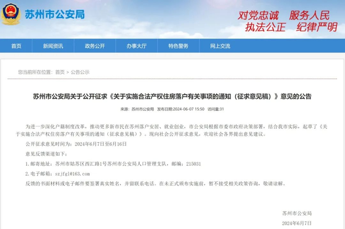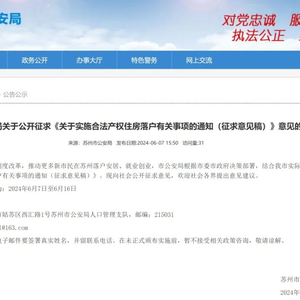 近日,苏州市公安局发布公开征求《关于实施合法产权住房落户有关事项的通知(征求意见稿)》意见的公告。