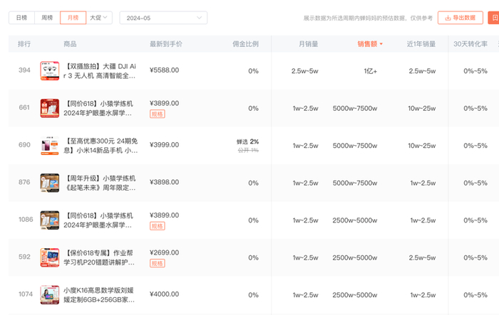 证券时报·e公司记者查询蝉妈妈数据发现,今年以来,猿辅导、作业帮、学而思、百度等品牌的学习机产品,长期占据抖音直播间数码产品销量排行榜前列。