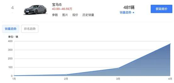 零售数据显示,今年1-4月,宝马i5累计销量为481辆,1-4月销量分别为5辆、16辆、90辆、370辆,销量数据尤为惨淡。