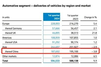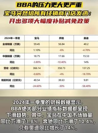 2024年一季度的财报数据显示,BBA绝大部分业绩指标数据都呈现下滑趋势。其中,宝马在中国市场销量同比下滑了3.8%,奔驰同比下滑了10.4%。
