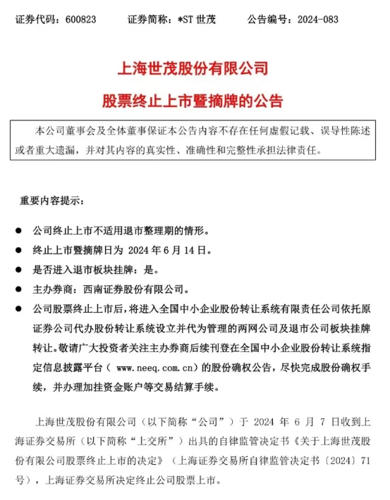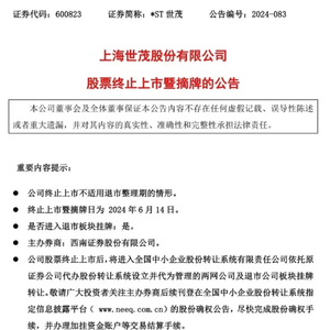 6月7日晚间,闽系房企上海世茂股份有限公司(600823.SH,*ST世茂)发布公告称,该公司收到上交所出具的自律监管决定书《关于上海世茂股份有限公司股票终止上市的决定》,上交所决定终止该公司股票上市。