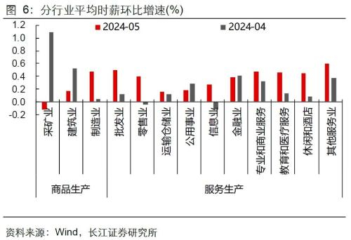 分行业来看,5月商品生产和服务部门就业双双转向扩张。其中商品部门新增就业增至2.5万人,主要集中在建筑业(2.1万人),或因先前获得的营建许可陆续开工带来用工需求上升;此外,制造业中非耐用品生产部门新增就业人数1万人,继续为商品部门作出正贡献。