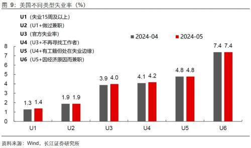 值得注意的是,5月U3、U4失业率有所抬升,但口径更宽泛的U5、U6失业率却保持稳定,意味着失业压力尚未泛化,回升的持续性有待观察。