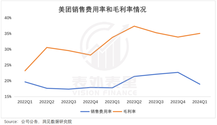 其实,美团早就从“剑拔弩张”转为“偃旗息鼓”。最新财报显示,其销售费用率从22.7%环比下降至18.9%,毛利率从34%环比微涨到35%。