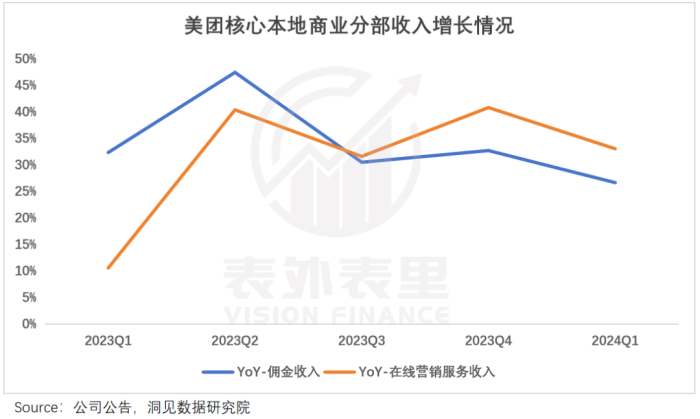 如下图,此前美团核心本地商业广告收入增速连续两个季度低于佣金收入增速,但2023Q4-2024Q1这一情况发生了逆转。而据最新财报:增长来源于在线营销活跃商家数量及平均收入增长。