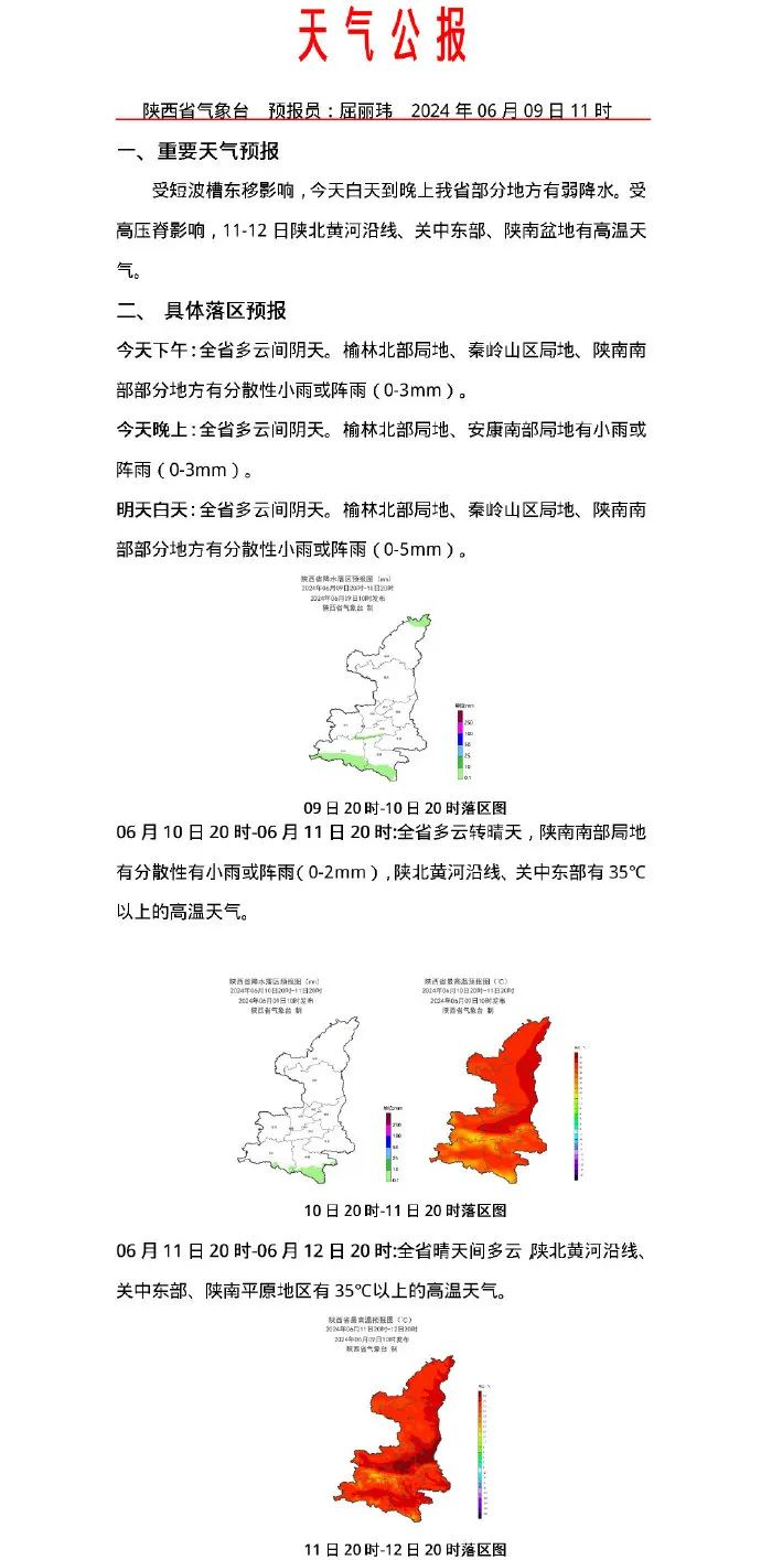 6月9日,据陕西气象消息,受短波槽东移影响,今天白天到晚上我省部分地方有弱降水。受高压脊影响,11-12日陕北黄河沿线、关中东部、陕南盆地有高温天气。