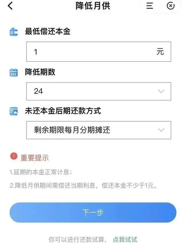 “降低期数只能选择1—24期,未还本金后期还款方式只能选择‘剩余期限每月分期摊还’。” 吴建说,他尝试点击还款试算,但只显示前三期的本金1元+利息,并没有两年后的月供金额。他认为,目前这项业务有些问题还不明确,比如申请后如果LPR下降,还款利息是否也会下降。因此,他暂时并不打算变更还款方案。