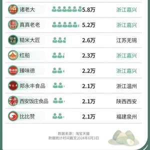 拼多多平台上,五芳斋、真真老老和广州酒家也是备受消费者喜爱的热点品牌。这些知名的粽子品牌,大多是中华老字号企业,集中在被称为鱼米之乡的江南地区。这既和这片区域盛产稻米、农耕发达的历史有关,也与长三角地区较早拥抱更先进的工业化生产有关。
