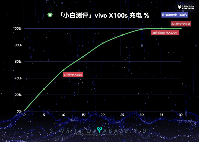 vivo X100s充电实测:5100mAh电池、100W有线充电,10分钟快速回电50%,31分钟前台充入电量100%,32分钟完全充满。