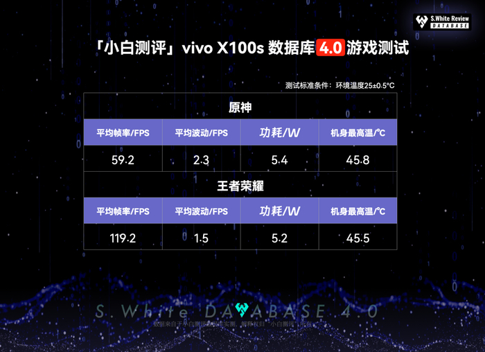 性能实测:vivo X100s在数据库4.0《王者荣耀》测试中平均帧率119.2FPS,功耗5.2 W,机身最高温度45.5℃;数据库4.0《原神》测试平均帧率59.2 FPS,功耗5.4 W,机身最高45.8℃。