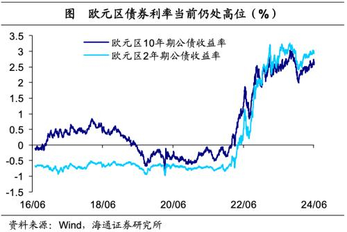 虽然欧央行在6月选择降息,但其表态总体仍偏鹰。一方面,欧央行强调当前薪资增速仍高,未来或仍将面临一定的通胀压力,并上调了对未来的通胀预期。具体来看,欧央行将2024年HICP同比增速预期由2.3%上调至2.5%,2025年HICP同比增速预期由2.0%上调至2.2%。