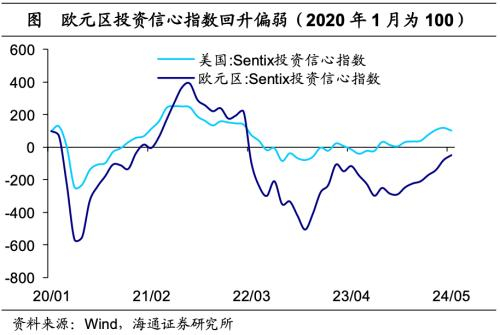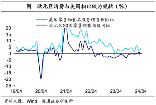 具体来看,欧元区在消费、投资、景气度等方面都明显弱于美国。在消费方面,欧元区20国零售销售同比增速自2022年下半年便持续处于负增长区间,2024年3月后增速才有所回暖。而美国在财政支持、居民财富效应以及超额储蓄的影响下,消费表现仍然稳定。