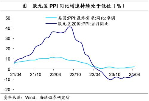 在通胀方面,欧央行与美联储均采取2%的通胀目标。2024年一季度以来,美国去通胀进展陷入停滞,而欧元区通胀回落则相对顺畅。2024年5月,欧元区通胀与核心通胀同比增速已回落至2.6%和2.9%,低于美国的3.4%和3.6%(4月数据)。此外,欧元区PPI同比增速也持续维持低位。因此,欧央行在“去通胀”方面或比美联储更有信心。