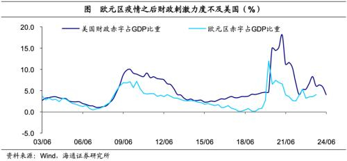 2023年以来欧元区经济之所以表现弱于美国。或一定程度上与欧元区财政政策刺激力度相对较弱有关。2023年,美国财政在失业率维持低位的情况下仍然顺周期扩张,赤字率再次上升,2023年维持在7%左右,其中二季度一度达到8%以上。相比之下,欧元区赤字率在2023年仅不足4%,对经济的拉动效果相对美国较弱。