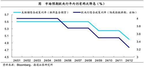从市场预期来看,目前市场普遍预期欧央行7月或维持利率不变,2024年年内仍将降息两次,并且降息时点与美联储保持一致,均分别在9月与12月进行降息。