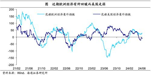 从对资产价格的影响来看,此次降息后欧元表现仍较坚挺。一方面或是因为欧元区经济数据近期有所改善,例如欧元区一季度GDP增速、零售消费同比与制造业PMI等均有所回升。而美国部分数据有所走弱,从而为欧元提供了一定支撑。从花旗经济意外指数来看,欧洲指数自2024年3月以来已处于美国之上。