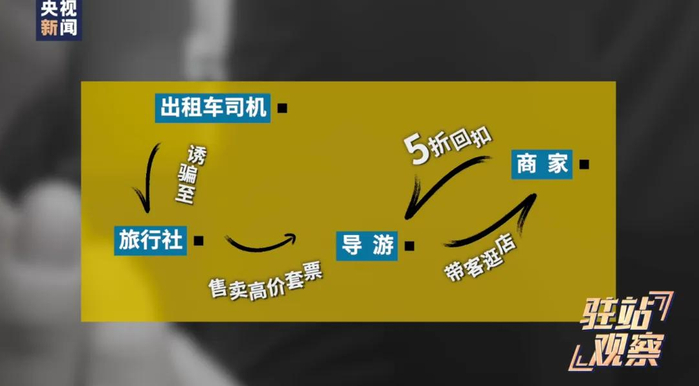 经过蹲点暗访,记者发现,从被出租司机拉到旅行社经营的散客中心购买高价套票,再到导游、商家联手诱导消费,环环相扣,已经形成一条完整的“灰色产业链”。