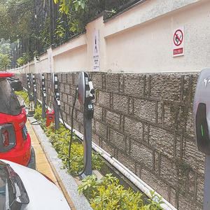 阳光城小区西北侧围墙边,12个造型时尚的充电桩按两组排开,几辆家用车正在充电。上前扫码后,记者注意到,与公共充电站类似,该充电桩支持使用App和小程序支付,执行浮动电价,每千瓦时电的使用费在1元左右,介于居民自行报装的充电桩和公共充电站之间。
