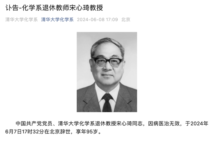 清华大学化学系6月8日发布讣告:中国共产党党员、清华大学化学系退休教授宋心琦同志,因病医治无效,于2024年6月7日17时32分在北京辞世,享年95岁。