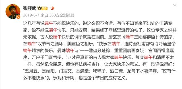 北大教授张颐武多次通过微博辟谣“不能说端午快乐”