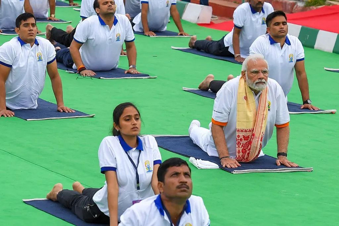 举例而言,莫迪在首个任期内提出,印度应该成为全世界的“导师”(梵文的“古鲁”),他还推动联合国设立国际瑜伽日。联合国确立6月21日为国际瑜伽日后,莫迪几乎每年都举办大型户外瑜伽活动,亲自展示瑜伽动作。2023年,莫迪在纽约联合国总部草坪带领上千国际政要和外交官员声势浩大地练习瑜伽,以庆祝国际瑜伽日。尽管已年过古稀,莫迪仍常常在演讲场合展示自己的体力,并将其归因于印度教传统文化的力量。