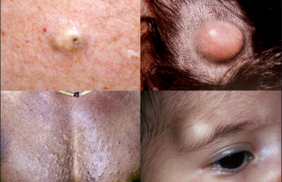 左上是表皮样囊肿;外毛根鞘囊肿(右上)多发生于头皮;皮样囊肿(右下)为先天性的,常见于前囟、前额外侧眉毛处;多发性脂囊瘤(左下)多发于胸部,表现为多发的肤色小结节。图片来源:参考文献