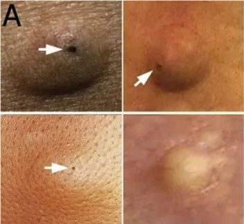 这种囊肿乍一看只是个几厘米的普通圆形或椭圆形小包,摸起来柔软 Q 弹,活动性很强,像个小球一样在皮肤下方小幅度游走,也就中间凹进去的小黑洞看着有点特殊。