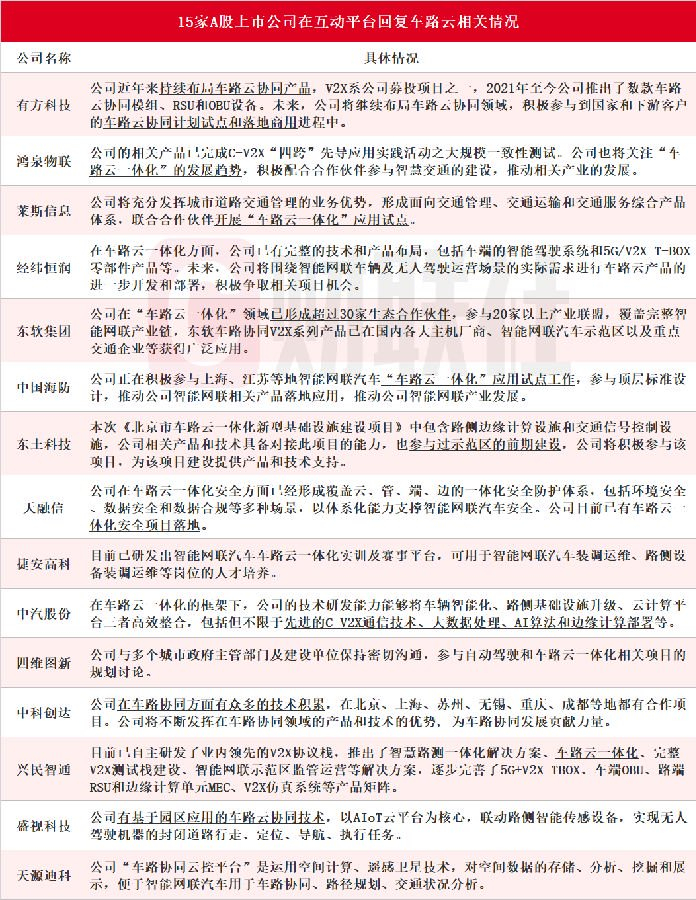 ②截至发稿,据不完全统计,15家A股上市公司本周在互动平台回复车路云相关情况(附表)。