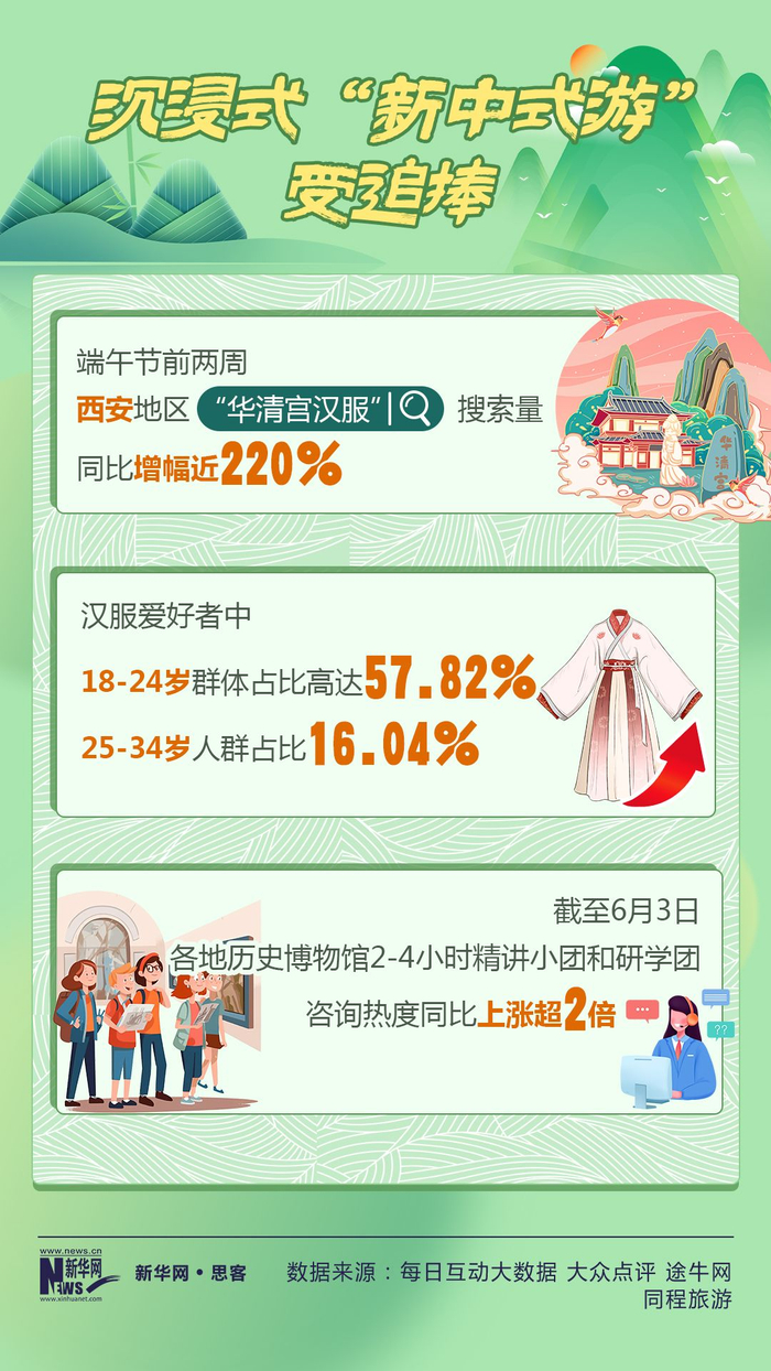 汉服妆造约拍、汉服主题酒店、国潮主题餐厅、园林茶馆点茶......在“新中式游”热潮下,国潮元素在这个端午假期进一步渗透到生活的方方面面,尤其受年轻人追捧。北京、西安、南京等文化名城,成为假期沉浸式“新中式游”的好去处。