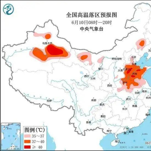 预计6月10日白天,北京、天津西部和南部、河北中南部、山东大部、河南大部、安徽北部、江苏北部以及新疆沿天山北部地区和南疆盆地东部、内蒙古东南部和西部、甘肃河西等地有35~36℃高温天气,其中,河北中南部、山东大部、河南中东部、安徽北部、新疆吐鲁番盆地等地部分地区最高气温37~39℃,河北南部、山东北部和西部、新疆吐鲁番盆地等地局地可达40℃以上。