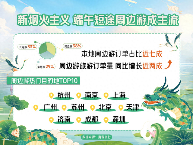 携程端午报告显示,周边游及本地游订单占据假日近7成旅游订单;端午周边游预订量同比去年增长近两成。杭州、南京、上海、广州、苏州、北京、天津、济南、成都、深圳位列周边游热门目的地前十。