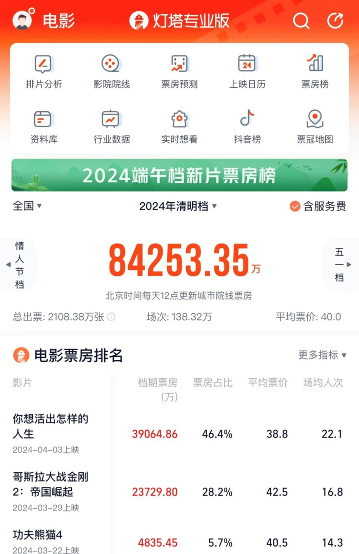 回顾近期的大盘数据不难发现,引进片在票房上呈现出进攻态势。例如,上映数日的引进片《加菲猫家族》在日票房榜上表现不俗,而清明档票房前三名《你想活出怎样的人生》《哥斯拉大战金刚2:帝国崛起》《功夫熊猫4》更是全部由引进片包揽。引进片在填补非大档期市场空缺方面扮演着关键角色。
